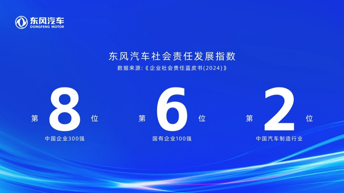 知责于心、担责于身、履责于行。2024年,东风汽车社会责任发展指数位列中国企业300强第8名,国有企业100强第6名;东风汽车入围“中央企业责任管理·先锋30指数(2024)榜单”排名第6名,并首次入选“《中央企业社会责任蓝皮书(2024)》十佳案例”。