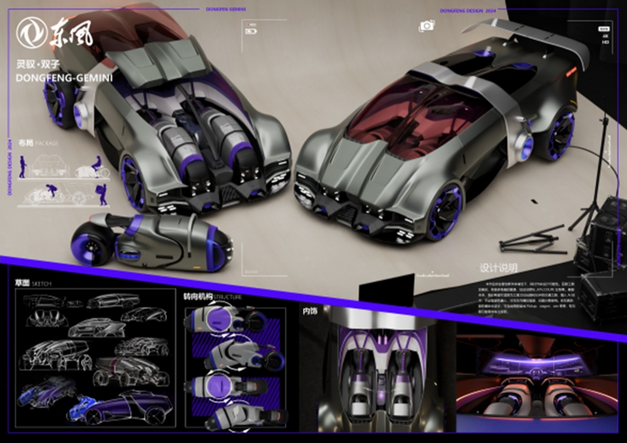 决赛现场,十支团队围绕智能化、可持续化、用户体验等方向展开创意碰撞。清华大学“绝对队”的《灵驭-双子》将汽车视为可创新驾驶体验和适应更多场景的玩具和伙伴,通过模块化设计实现智能驾驶与人工操控的无缝切换,其前瞻性技术方案赢得评审团高度评价。