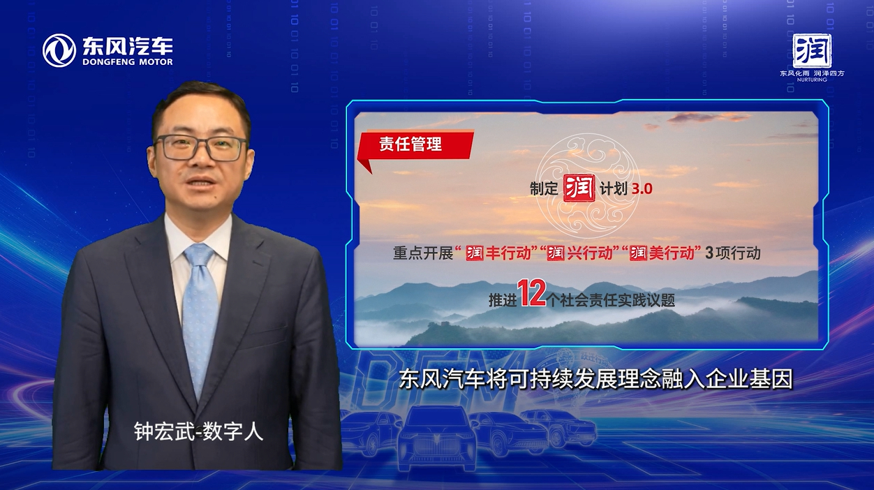 会上,东风汽车携手旗下岚图汽车、东风柳汽、东风日产、东风本田、神龙汽车、郑州日产、东风南方7家单位联合发布了《2024可持续发展报告(社会责任报告)》,并创新发布东风研发总院ESG暨科技创新专项报告和社会责任优秀案例集两大专项,打造“1+7+2”可持续发展报告矩阵;AI数字人——中国社会科学院教授、责任云研究院院长钟宏武对《东风汽车2024可持续发展报告》进行专业解读,多维度解析东风2024年履责实践。