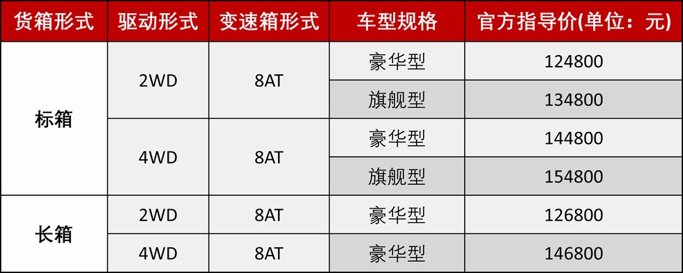 新车官方指导价为12.48万元—15.48万元,有两驱和四驱车型,并在标箱版基础上,同步推出长货箱版,以合资品质,亲民的价格,满足各地各行业用户对皮卡多功能用途的不同需求。