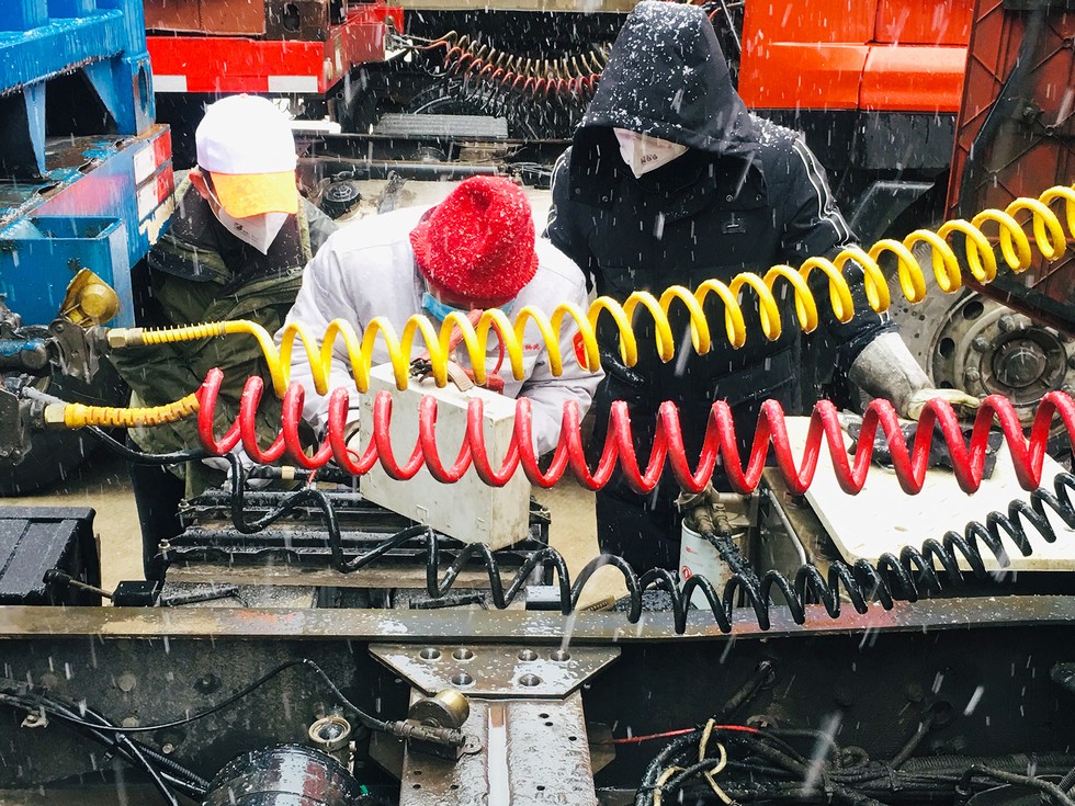 东风车城物流员工在风雪中维护车辆