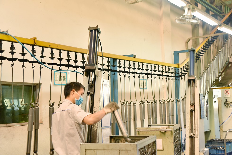 减振器挂上输送架准备进入喷漆室