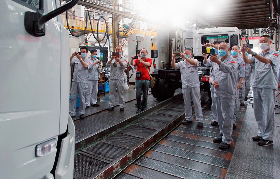 2020年6月28日装配一线开始搬迁,员工共同记录最后一辆VR天锦车的下线