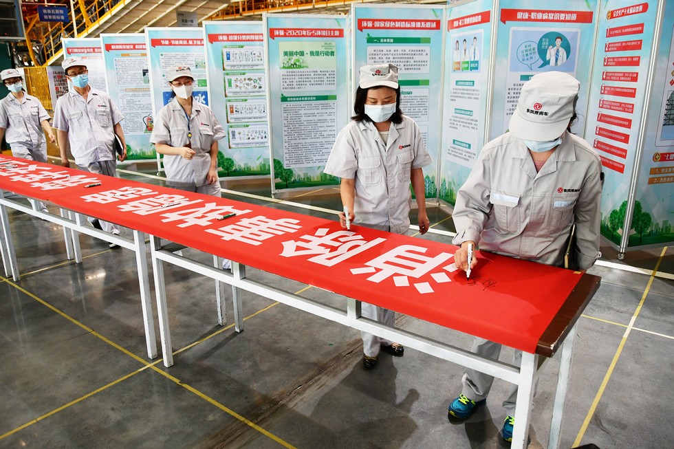 东风乘用车公司员工在倡导安全环保的横幅上签名