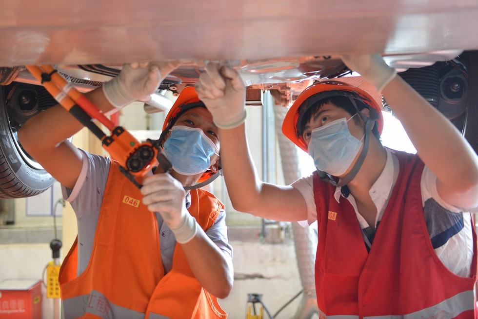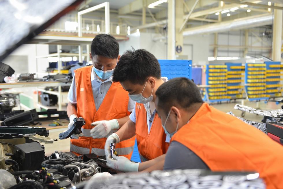 试制车间,技术人员正争分夺秒调试试制车辆 记者 周惠明/摄