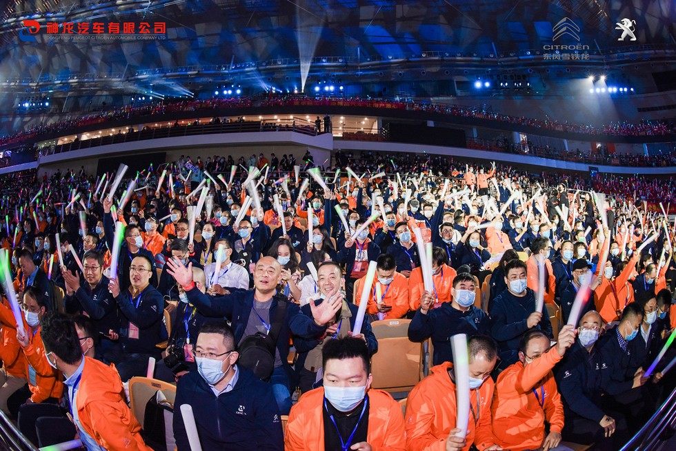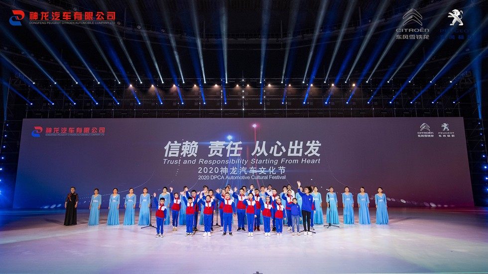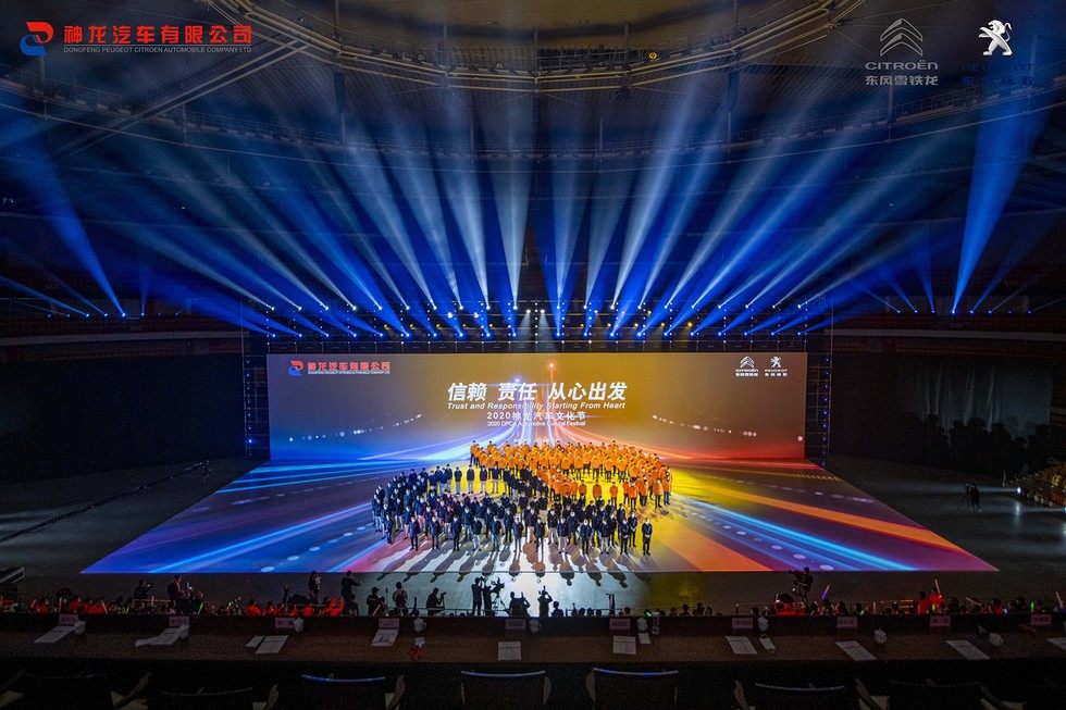 200名神龙公司员工汇聚舞台中央,摆出神龙汽车logo造型