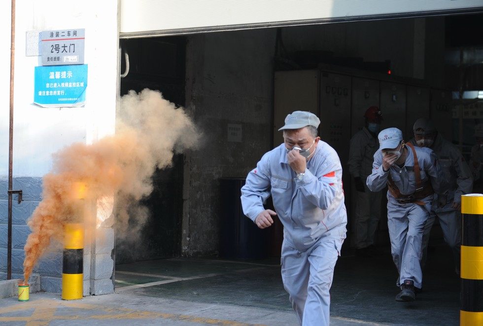 11月6日,东风商用车有限公司车身厂在涂装二车间开展消防疏散演练。涂装二车间是特级防火单位,此次演练模拟废漆处理室因超负荷使用电器设备,造成电线短路,引发火灾。相关人员第一时间切断电源,并拨打火警电话,快速组织员工有序疏散,防止疏散过程发生踩踏和跌倒。在“逃生”过程中,86名员工戴好口罩,捂住口鼻,弯腰俯身,从距离岗位最近的安全门撤离,用时3.8分钟,全部顺利逃离火灾现场。(特约记者 郭飞 文/图)