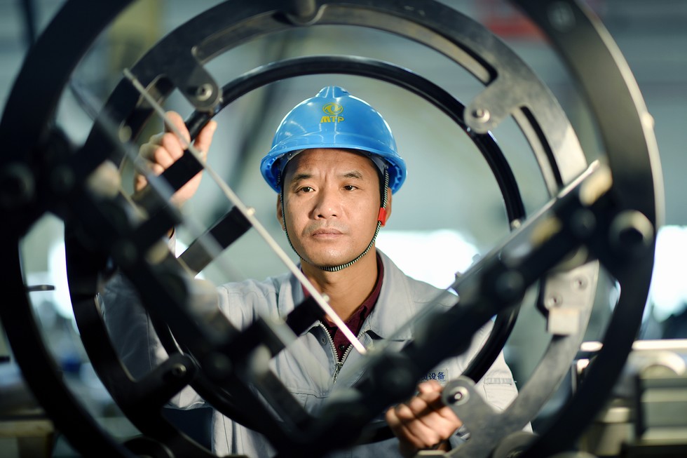 调试现场,机器轰鸣,朱卫东一手拿着气压阀控制设备由上至下移动,一手持仪表盘,凝神观察着每一个高度的误差。高度差超标时,则要调整滑鞍下的气压垫,往前倾一点、往后倒一点,直到仪表盘上的数字归于精准。在他手中,这些设备似乎都有了生命,而每一次安装调试都是一次“将心比心”的交流。