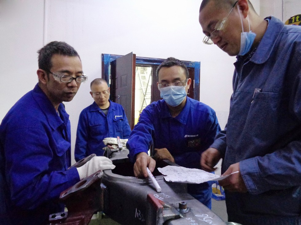 生产流水线上,下道工序就是上道工序的客户。日前,东风德纳车桥十堰工厂桥壳车间开展质量攻关,顺利解决了“焊渣飞溅造成桥壳内壁螺纹毛刺”的质量问题,使下道工序工作更为顺畅,赢得了他们的欢迎和褒奖。据介绍,一根车桥有多个位置不同的管线,在加工桥壳时需要焊接管线座,焊接的焊渣飞溅到支座内壁螺纹上,会影响安装质量和生产进度。为此,桥壳车间通过多次质量攻关,将桥壳部件上的管线支座变焊为铸,有效避免了焊渣飞溅现象的发生。图为员工一起进行质量攻关。(通讯员 顾善静 文/图)