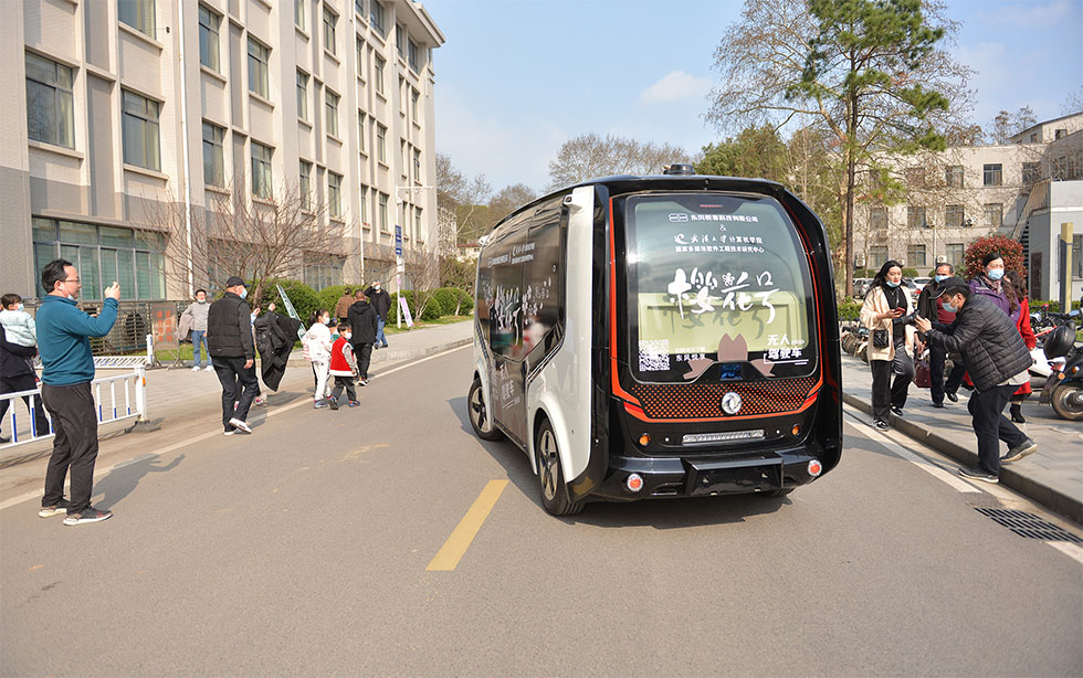 赏樱路上,智慧与美貌并重的“樱花号”吸引不少医护围观,试乘体验热情高涨。从试乘点出发,沿教学楼前直行,经过一个垂直弯道和两个急弯,从卓尔体育馆后方绕回,体验路线全程约1公里。由于道路崎岖、游人较多,为保障乘客和行人安全,“樱花号”行驶速度控制在10公里/小时左右。