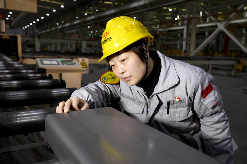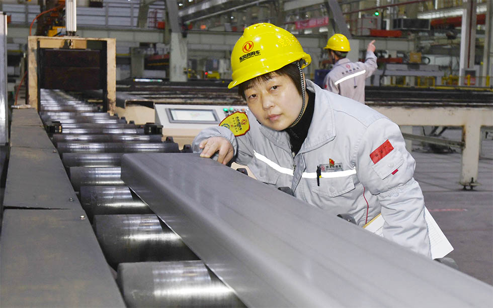 梁海燕(左一)抽查员工纵梁腹宽自检