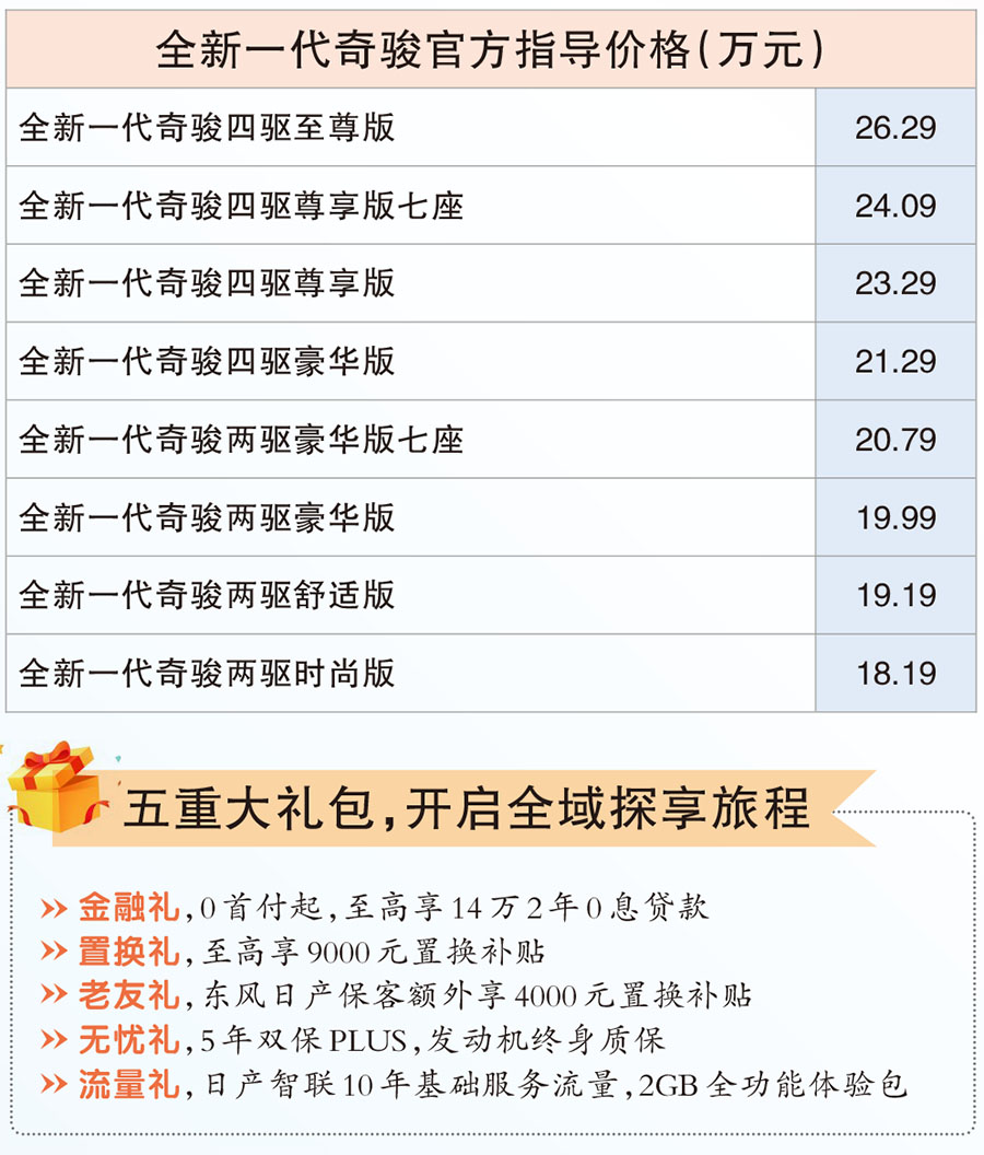 (记者 罗付雄鹰)7月30日,“纵擎天地,天生奇骏”东风日产全新一代奇骏上市发布会在内蒙古响沙湾举行。此次,全新一代奇骏共推出8款车型,官方指导价格为18.19万元—26.29万元。