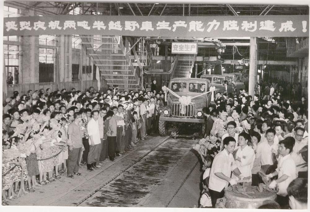 ■1975年7月1日,总装配厂庆祝两吨半越野车下线盛况,时任中共建设二汽现场领导小组组长饶斌亲自开下线