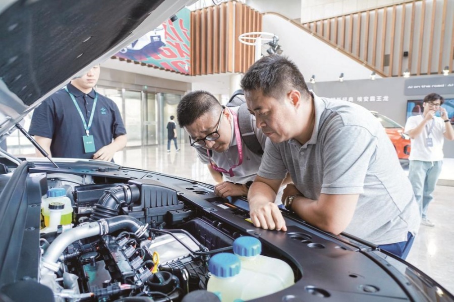 8月29日至9月1日,2024泰达汽车论坛在天津举行。东风新能源汽车东风奕派eπ008在会场展出,大气的外观、出色的性能、智能化配置以及充裕的驾乘空间,赢得与会人员的关注与赞誉。图为参会人员仔细观察东风奕派eπ008动力系统。