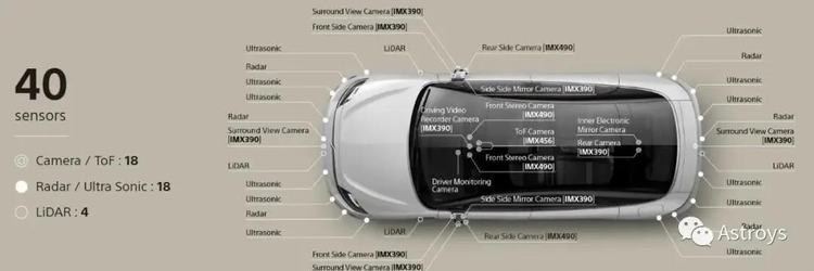 索尼的视频预示着Vision-S具备一些自动驾驶的功能。根据索尼官网所述,配有40个传感器(摄像头/ToF 18个、毫米波雷达/超声波雷达18个、激光雷达:4个)。
