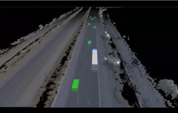这是仿真城市(Simulation City),谷歌旗下Waymo测试其自动驾驶汽车的虚拟世界,可为现实世界的体验做准备。顶部为蓝色的灰色立方体代表Waymo的一辆自动半挂卡车,而绿色立方体则是人工高速公路上的所有其他车辆。