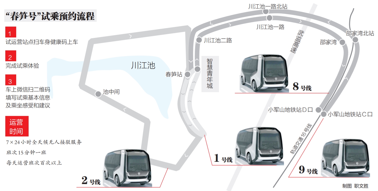 据了解,“春笋号”是纯电动车,共15辆,在小军山地铁站与车都青年城之间进行示范运营,提供国内首个7×24小时全天候无人接驳服务。常态化运营路线现有4条,班次15分钟一班,每天运营班次百次以上。市民到固定的站点,扫描出示健康码就可上车免费体验。
