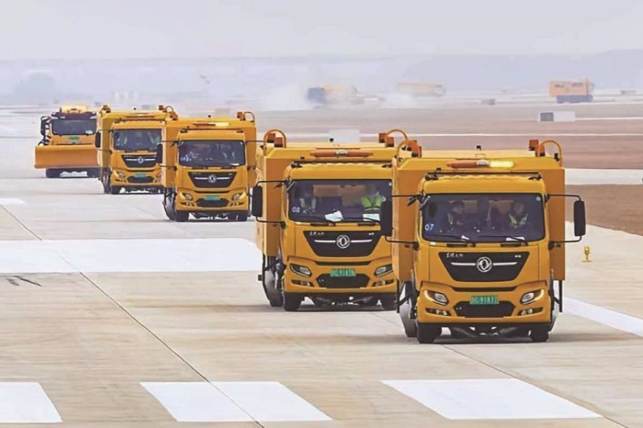 为应对寒潮和雨雪冰冻天气,武汉天河机场飞行区配备22台吹雪车、5台除冰撒布车等作业设备,搭配跑道摩擦系数检测车等辅助工具,确保航班正常起降;机场公共区域的排水车、除雪车、撒盐车随时待命,保障进出旅客安全;飞机维修中心10余辆航空器除冰车完成调试,各类防雪除冰设备设施均准备就绪,全力守护航班飞行安全。图为东风吹雪车驻守机场。